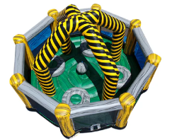 Especially popular with older kids and adults, the Wrecking Ball has large pedestals to stand on and features a big inflatable wrecking ball on a sturdy cord that's there to knock people off. A 4 player game, each standing on their own podium, one attempting to knock other players off their podium with the "Wrecking Ball" ed pads. As the ball swings back, try and grab it! The player, who grabs it first, then hurls it at another player, trying to knock that player off. The last player standing is the champion. Great for older kids and adults!